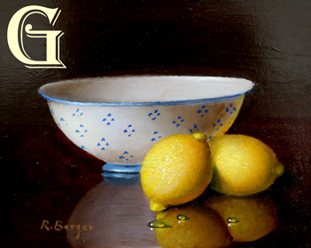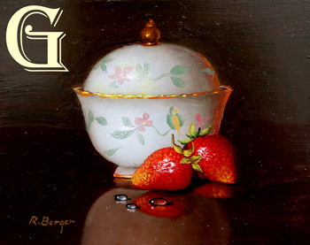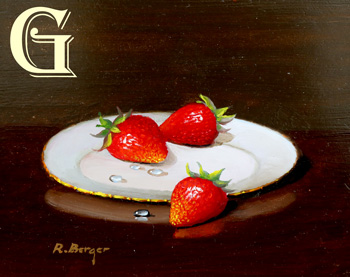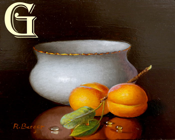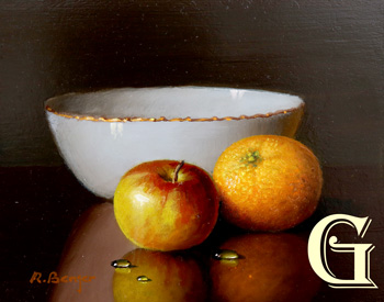 His miniature still life panels are done in the tradition style and feature realistic depictions of fruit, fine porcelain and glassware. His attention to detail, mastery of light & shadow and exquisite detail make them timeless in their appeal.